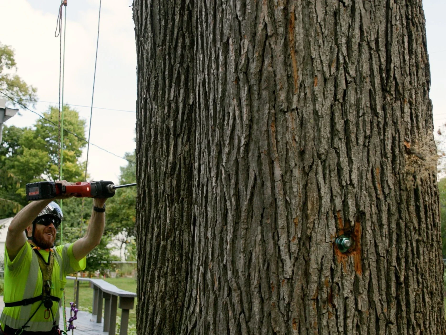 Russell Tree Experts offers tree bracing services to reduce the risk of two or more tree stems from splitting apart, or to fasten and support a split or cracked union, improving the overall structure of your tree. This is accomplished by installing a number of threaded steel brace rods to prevent select tree unions from spreading or twisting apart or to prevent a split or cracked union from worsening. Tree pruning and tree cabling are commonly performed (and recommended) alongside the tree bracing service.