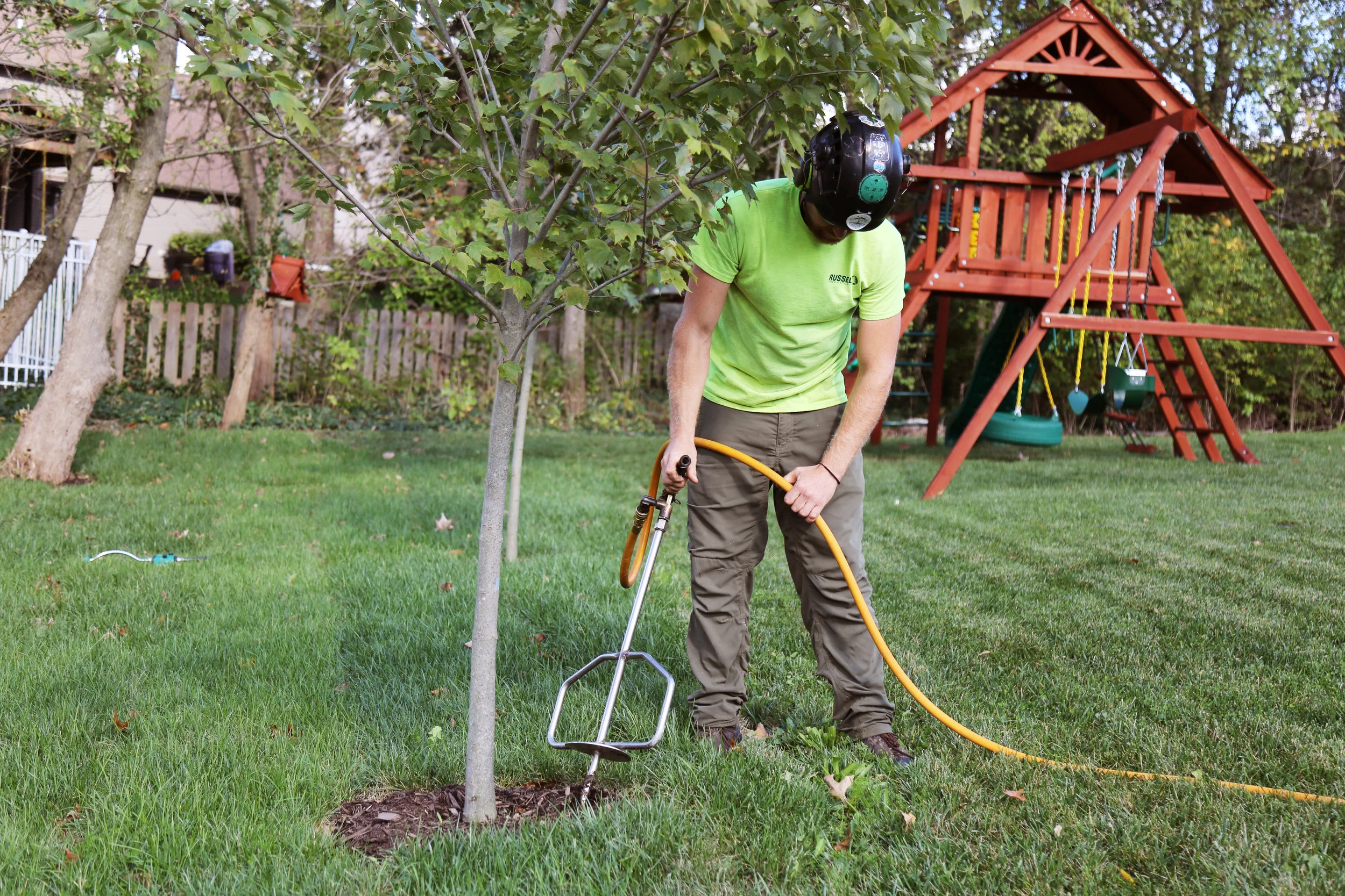 Russell Tree Experts offers fertilization services for trees and woody plants to help maintain tree health and vigor and to improve the condition of the soil. Without the proper nutrients, a tree’s health and growth can be stunted and appearances can start to look unsightly. Symptoms of nutrient deficiency may include yellowing chlorotic leaves, brown necrotic leaves, wilted leaves, and leaf scorch. Some nutrient deficiencies can resemble symptoms similar to pest or disease issues, which is why we often recommend a soil, leaf, or plant tissue sample to diagnose the problem and recommend the best management strategy.
