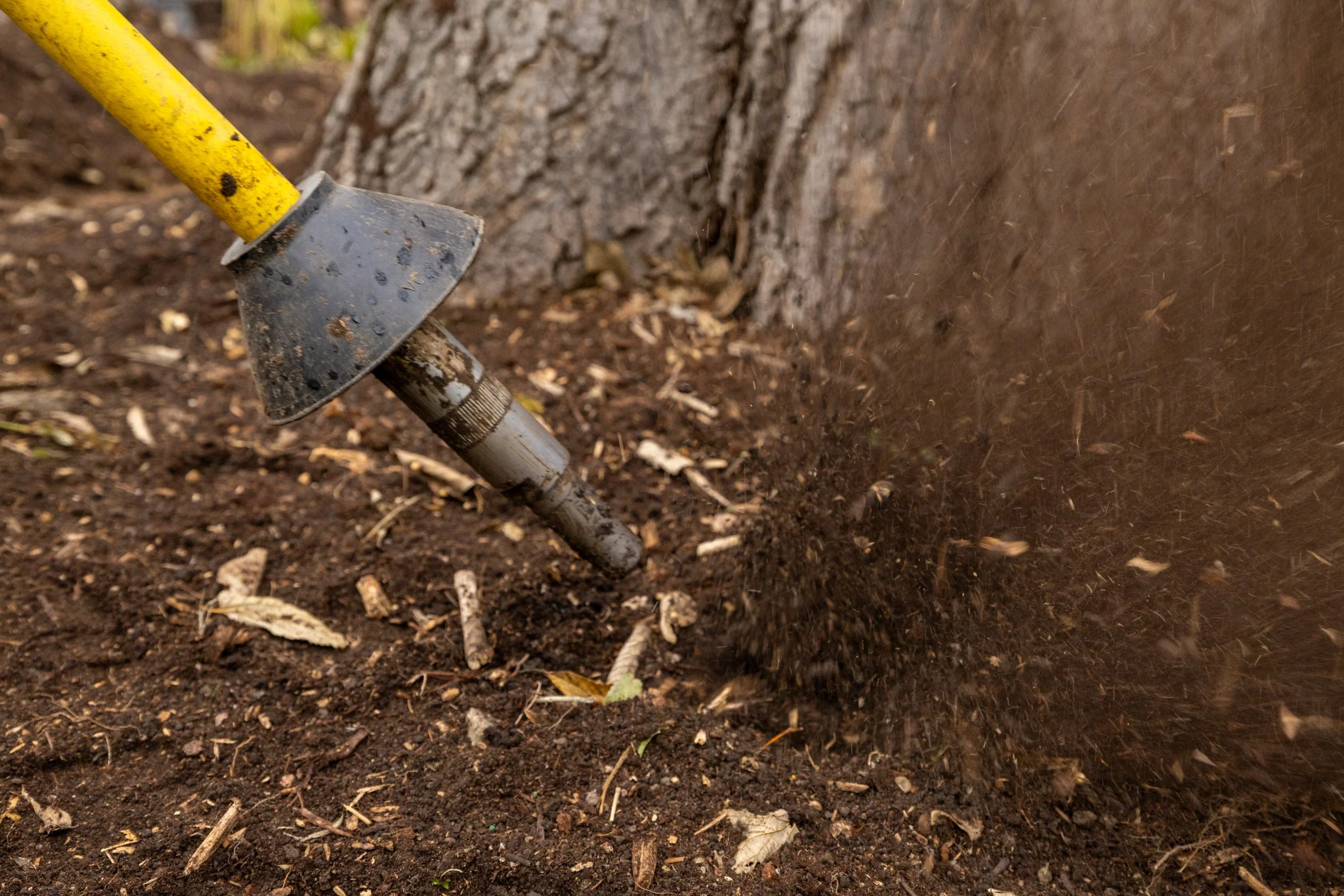 We use an air excavation device to perform root zone invigoration or vertical mulching to break up compacted soil and add high-quality soil amendments around either the tree’s root zone or in a grid-pattern within the canopy drip line.