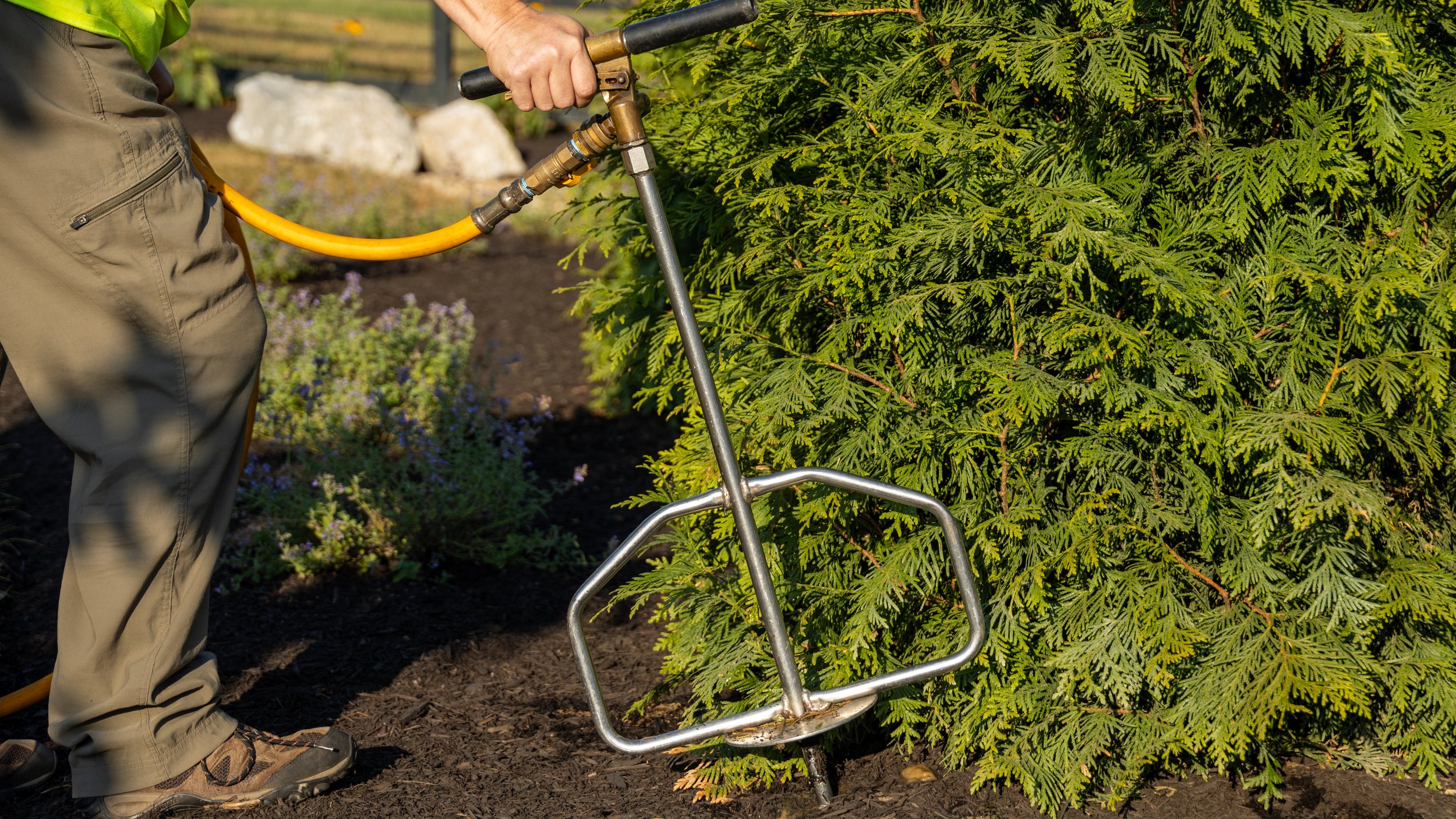 Liquid deep root feedings use an irrigation lance to inject liquid fertilizer a few inches below ground level to directly target the tree’s feeder roots, minimize water runoff, and to reduce competition from turfgrass or other aboveground plants.